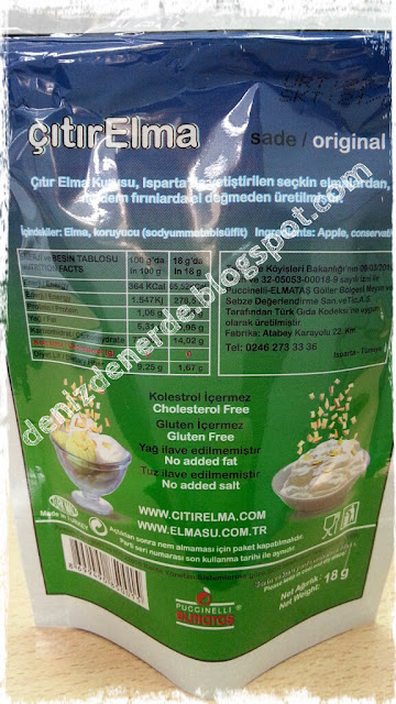 Elmayı almışlar minik parçalara bölmüşler fırınlarda kurutmuşlar, ellerine sağlık diyorum ben bayıldım. Yağ, tuz yok, katkı yok, glutensiz. 18 gr lık paket bir adet elmadan oluşuyor.